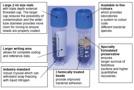 標記顏色的25 個小珠被包裝容納在包含保存劑的保存管里,小珠被沖洗和吸附細菌在上面,之后保存管在貯存期內保持在-70°C,當需要培養(yǎng),單個小珠很簡單的移出保存管,并直接劃線在微生物培養(yǎng)基上。